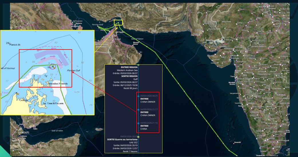 The Maritime Awareness System (MAS) enables detection of abnormal behaviors such as those observed in Iron Maiden and Bogazici. By correlating AIS data with satellite observations, MAS identifies inconsistencies, route deviations and suspicious identity changes. MAS provides a real-time and reliable maritime picture, even in complex environments like the Strait of Hormuz.